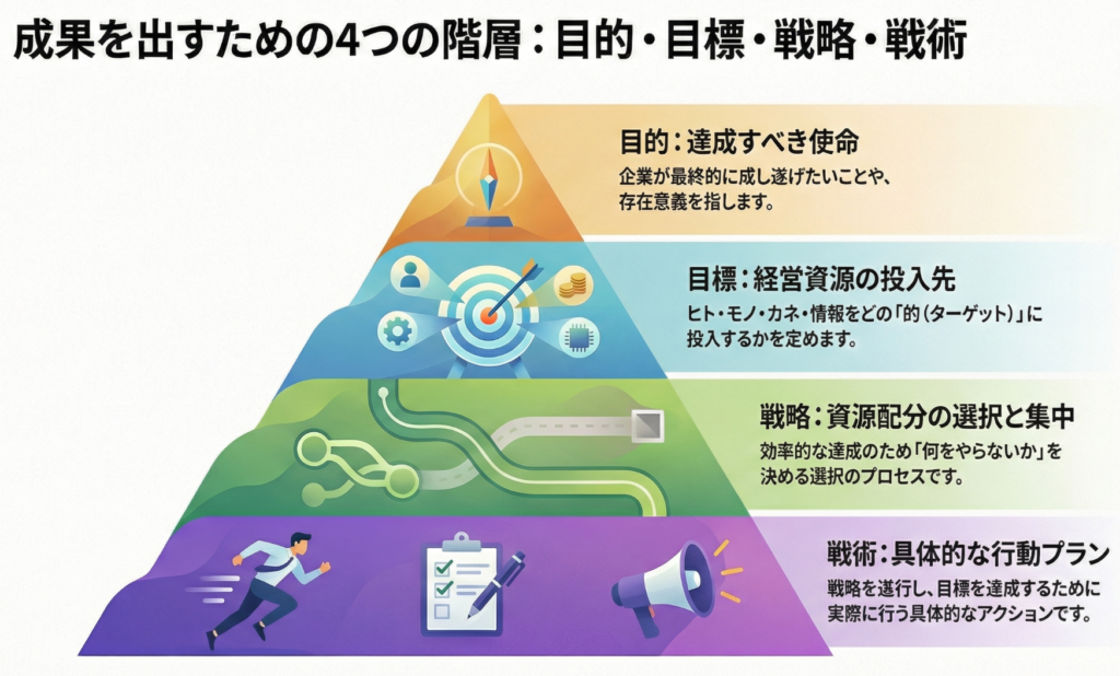 マーケティングの現場では「目的」「目標」「戦略」「戦術」といった言葉が飛び交いますが、それぞれの定義が曖昧なまま進めてしまうケースが少なくありません。
