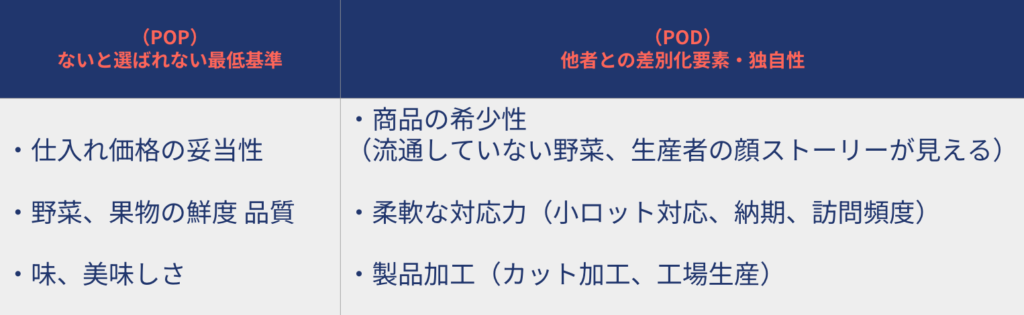 ・例:「希少野菜の取り扱い」「小ロットなどの柔軟な対応」「加工場の有無」など。