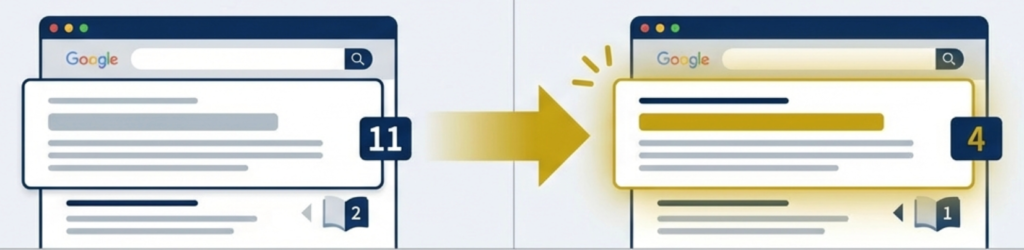 上位記事は微調整にとどめ、8位〜12位の記事を上位に上げる施策に注力するのが鉄則です。