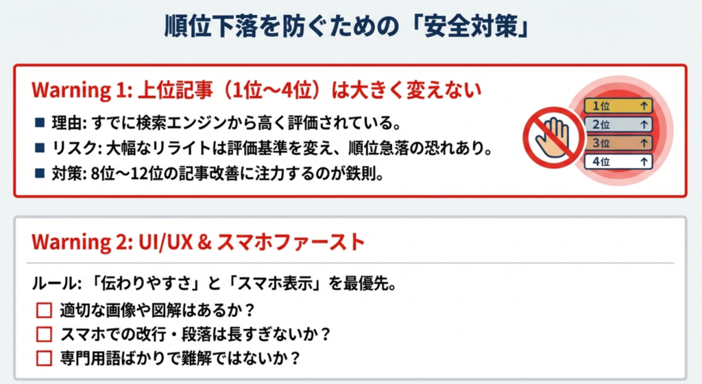 記事を選定していざリライト作業に入る前に、注意すべきポイントがあります。良かれと思って修正した結果、かえって順位を落としてしまうリスクがあるためです。