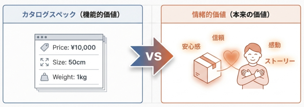 ここで大切なのは、カタログスペック(性能や価格)ではなく、顧客が感じている「情緒的な価値」や「付加価値」にフォーカスすることです。
