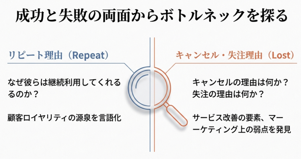 さらに、成功事例だけでなく「キャンセルの理由」や「失注の理由」を聞くことも、提供サービスのボトルネックとなっている部分や、改善点の要素を見つけるためにも、非常に有効です。