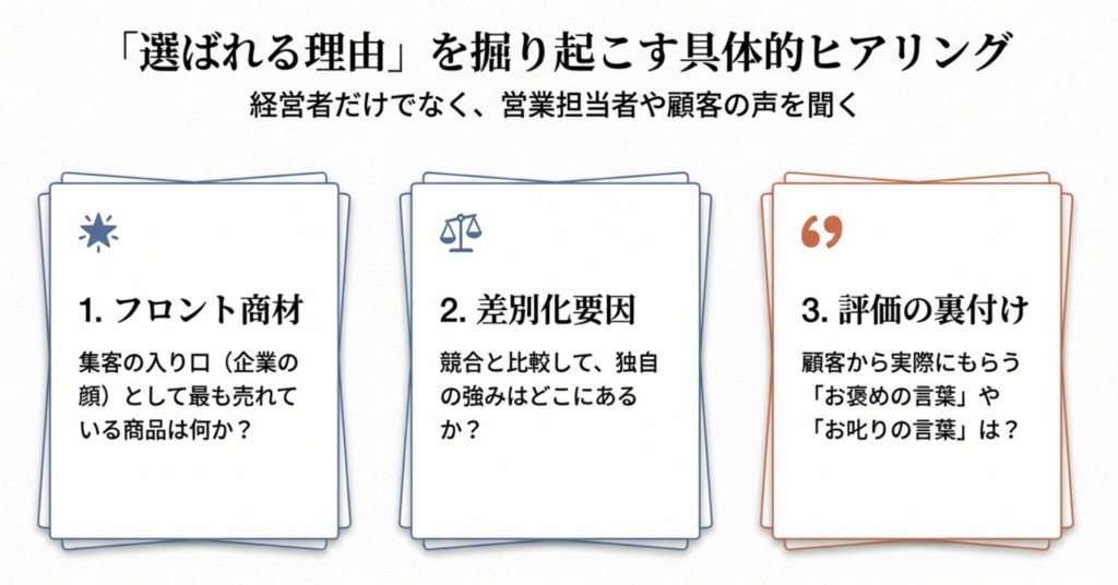 また、経営者だけでなく、顧客と接する最前線の「営業担当者」や、実際に商品・サービスを利用している「お客様」にもヒアリングを行うことで、よりリアルで具体的な「選ばれる理由」が見えてきます。