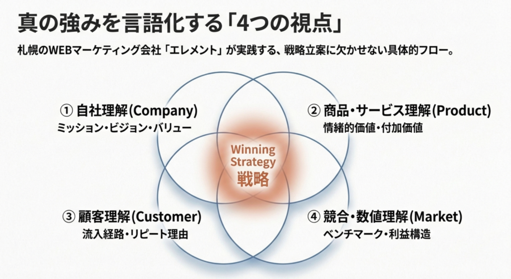 本記事では、札幌のWEBマーケティング会社「エレメント」が実践しているヒアリングの具体的なフローと、戦略立案に欠かせない4つの視点について詳しく解説します。