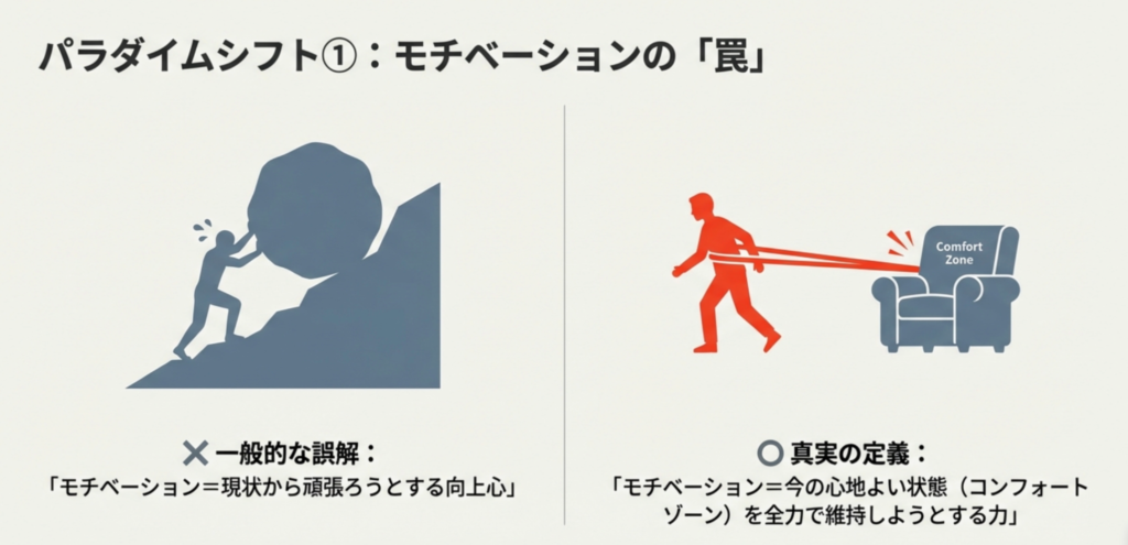 つまり、モチベーションとは「現状から頑張ろうとする向上心」ではなく、「今いる心地いい状態(コンフォートゾーン)を維持しつづけようとする力」だということ。