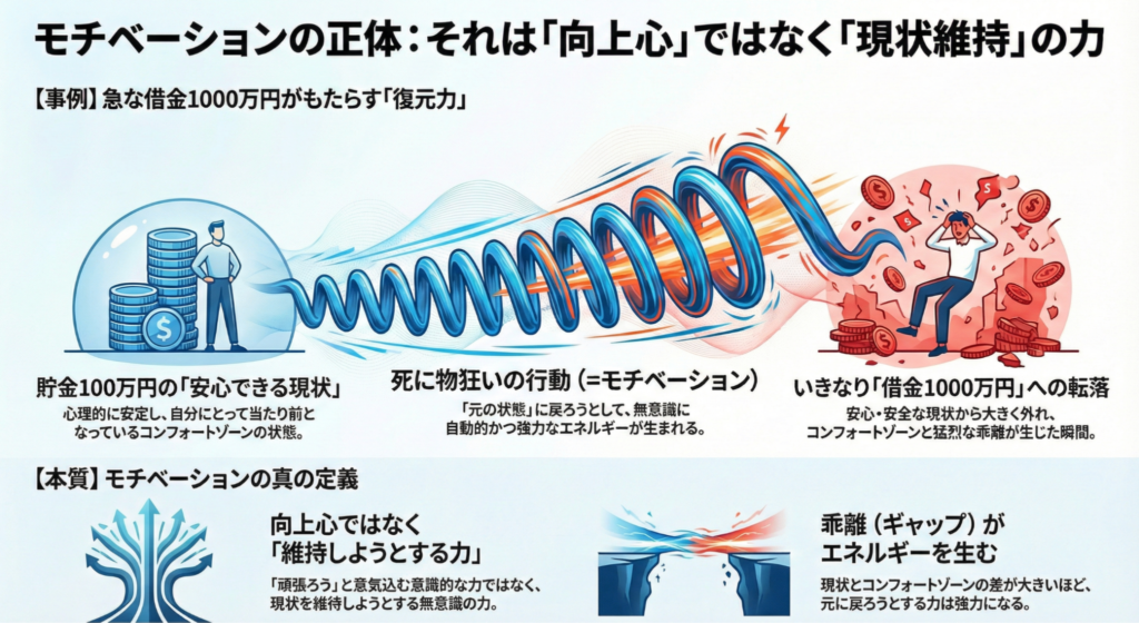 このように、自身の置かれた安心・安全な現状(貯金100万円の状態)から乖離した瞬間(借金1000万円の状態)に、無意識に元に戻そうとして自動的に生まれる強力な力こそが、モチベーションの正体なのです。