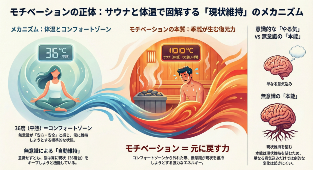 このように、動画内では、「コンフォートゾーン(安心・安全な状態)から外れた時に、無意識的に元の状態に戻そう・維持しようと働く強力な力」こそが、モチベーションの真の正体であると説明しています。