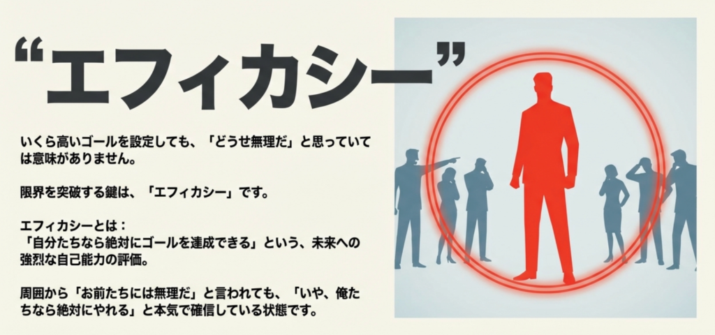 いくら高いゴールを設定しても、心の底で「どうせ無理だ」と思っていては意味がありません。そこで最も重要になるのが「エフィカシー」です。