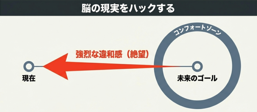 「ゴールを達成している未来の姿」こそが本来の自分たちだ(未来に自分のコンフォートゾーンを置く)と脳が錯覚し、達成できていない現状に対して違和感(絶望)を覚えるようになるのです。