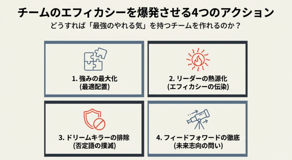 「お前には無理だ」といった否定的な言葉は、組織のエフィカシーを最も奪います。相手の可能性を信じ、自信を育む前向きな言葉を意図的に使い続けることが不可欠です。